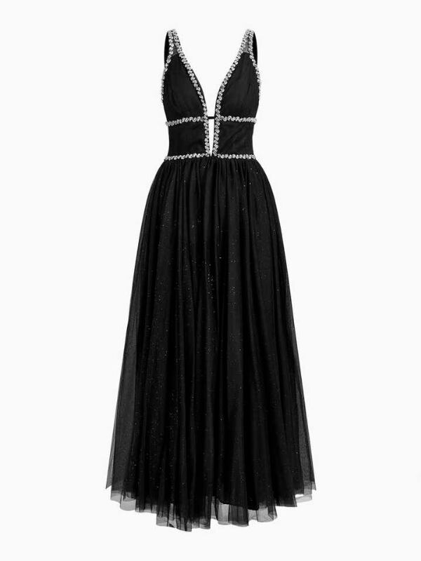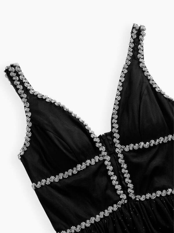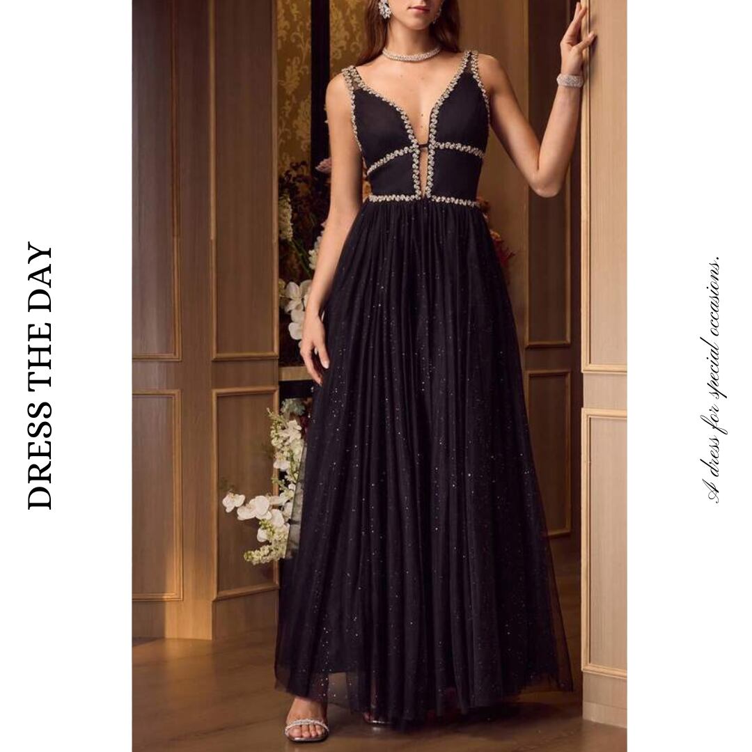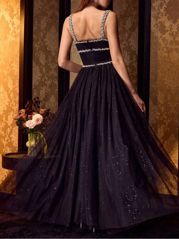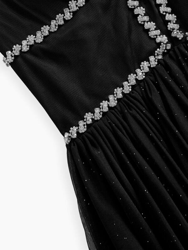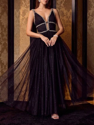きらめくチュールスカートが動くたびにふんわり広がり、存在感をプラスします。背中をきれいに見せるデザインで、特別なシーンに映える一着です。