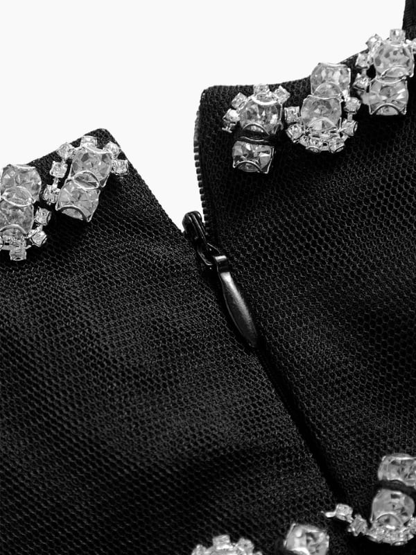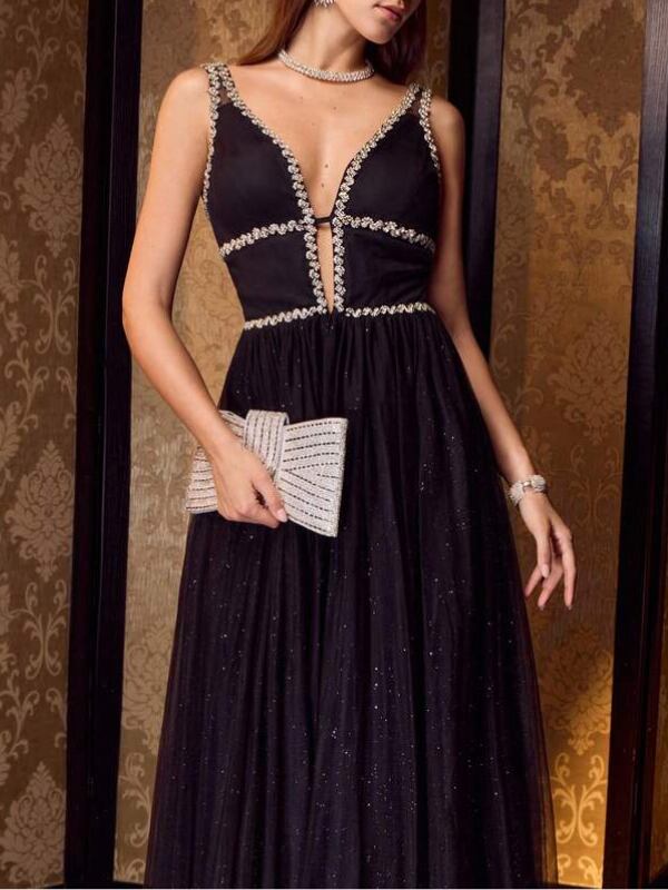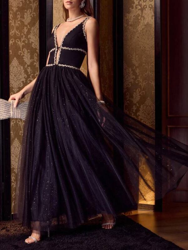縁取りのジュエル装飾が華やかに輝く、上品なドレス。深めのVネックがデコルテを美しく見せ、ウエストラインをすっきり強調します。
