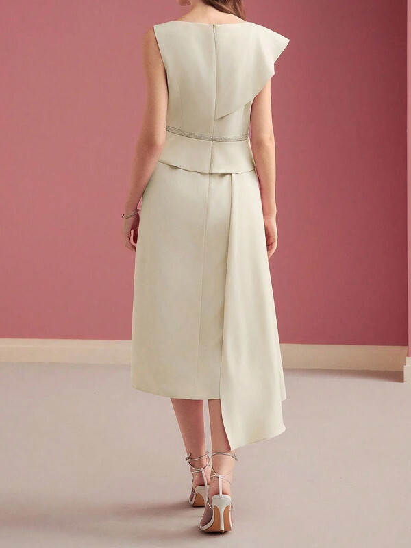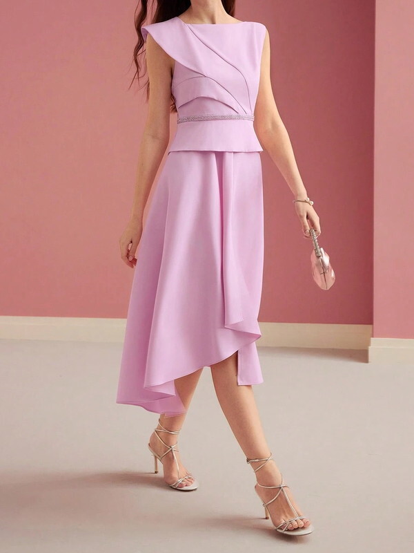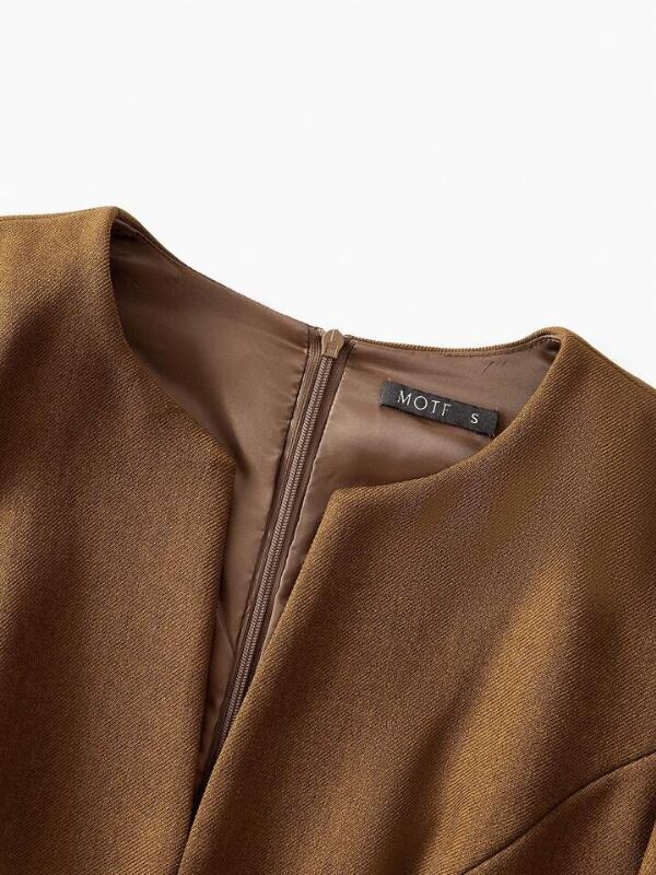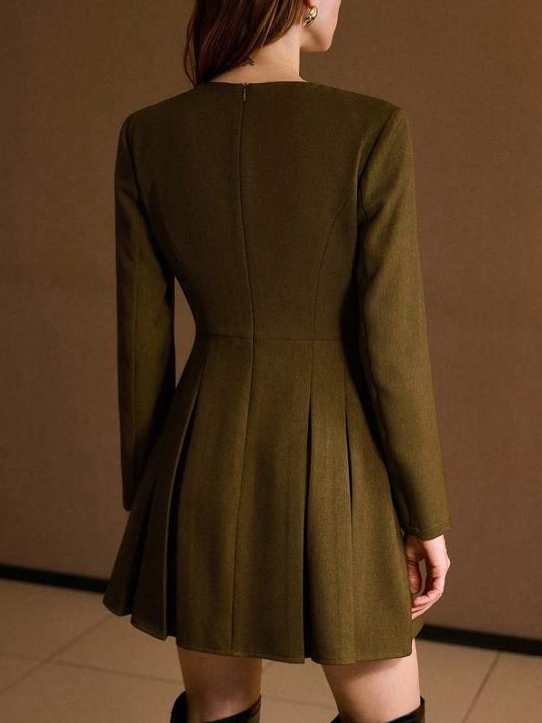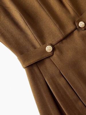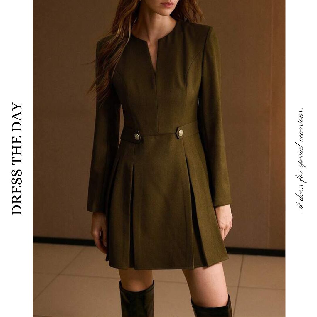 深めのスリットネックが上品さを引き立てるドレスです。ウエストの飾りボタンがさりげなくアクセントになり、スタイルをすっきり見せてくれます。裾にかけて広がるタックプリーツが動くたびに綺麗に揺れ、女性らしいシルエットを演出します。ブーツとも相性が良く、エレガントな着こなしが楽しめます。