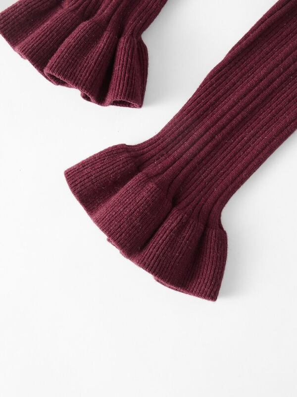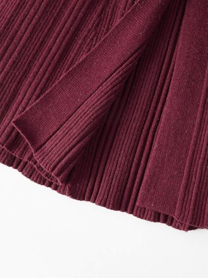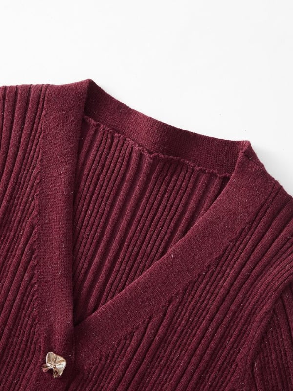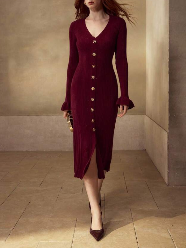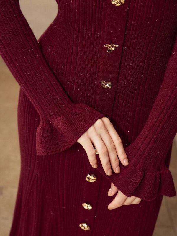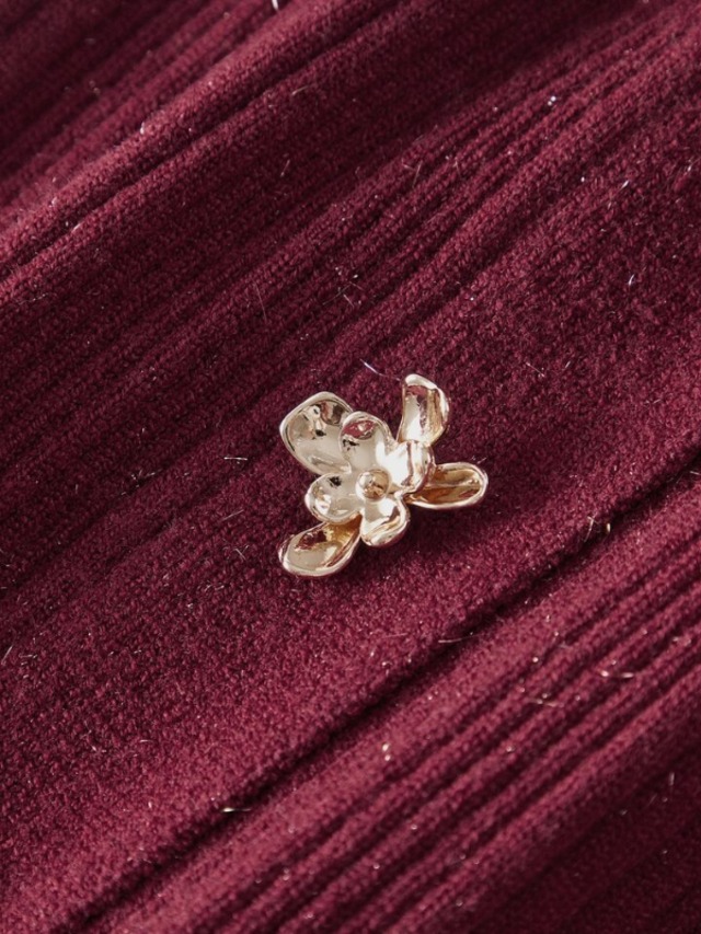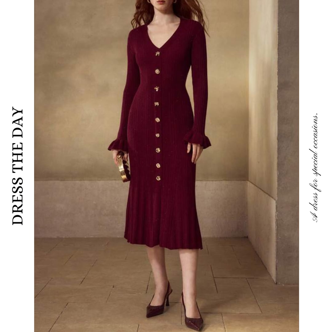深みのあるバーガンディカラーが女性らしい印象を高める、すっきりとしたリブ編みが魅力のドレス。フロントに並ぶフラワーモチーフのゴールドボタンが、さりげない華やかさを添えます。袖口のフレアデザインが手元を優雅に見せ、大人っぽいミディ丈で幅広いシーンに合わせやすい一着です。