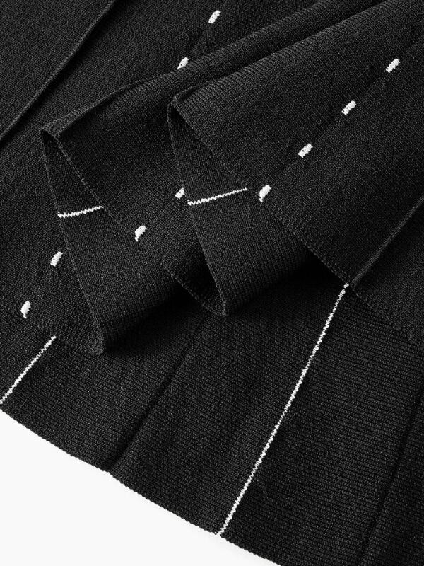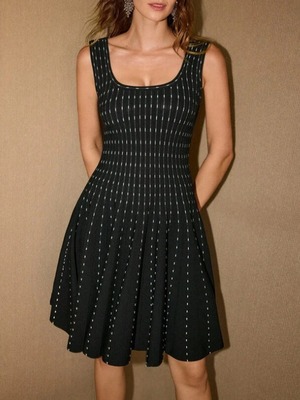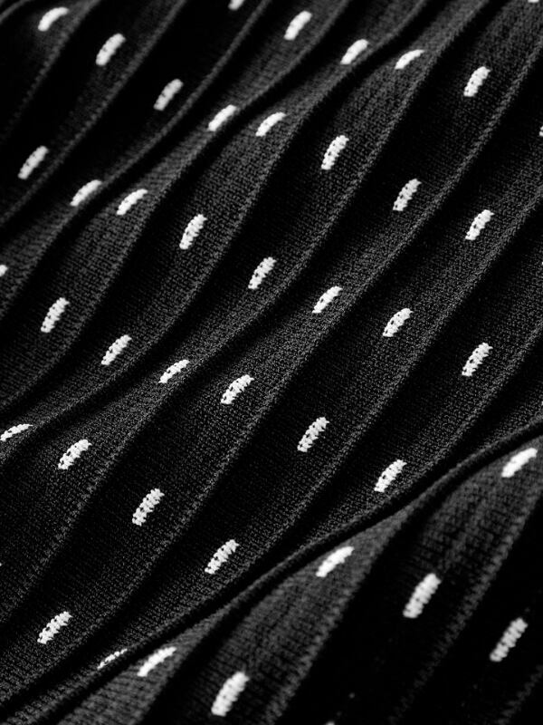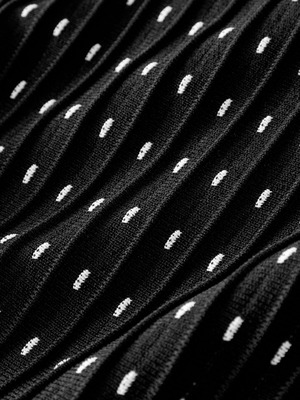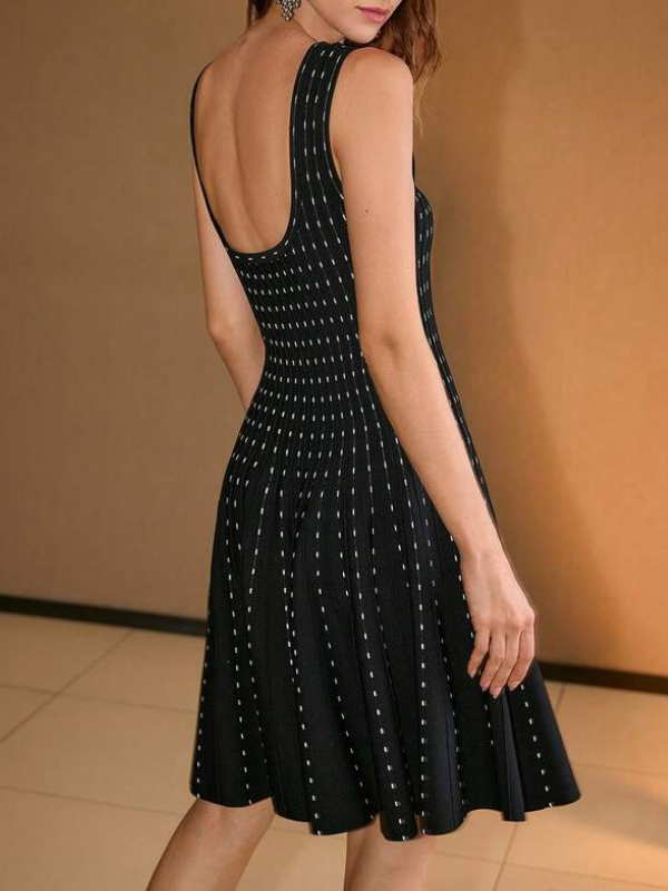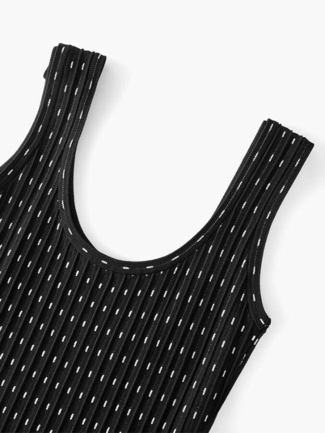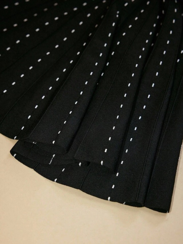細かいドットのラインがすっきり見えるドレスです。ほどよく体に沿うトップと広がるフレアが女性らしいバランスをつくります。動くたびに揺れて華やかな印象になり、特別な場にも使いやすい一着です。